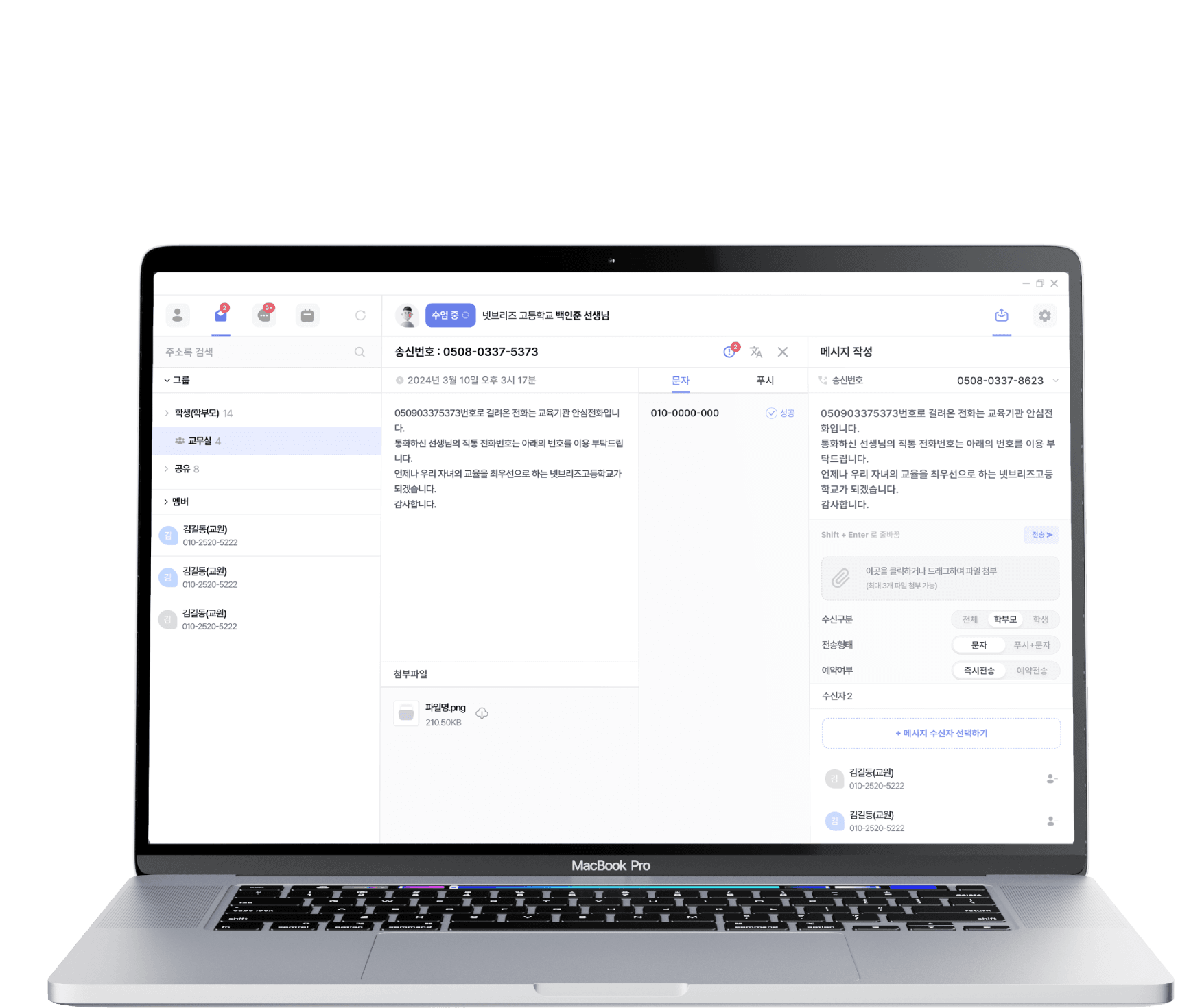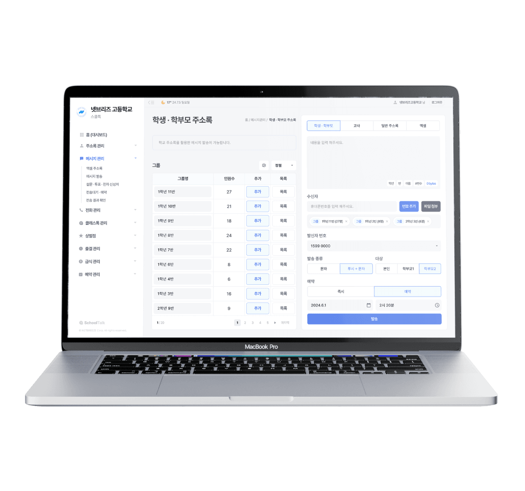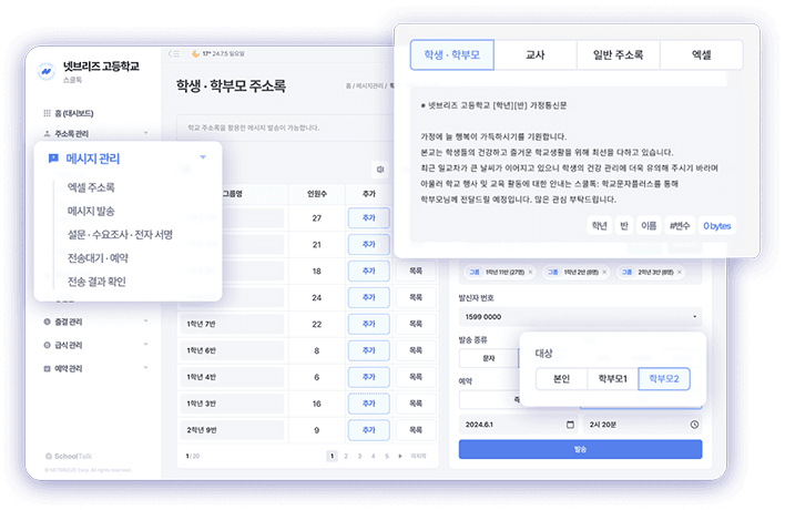 학교 주소록 관리부터 메시지 발송까지 한 번에 처리할 수 있다니 정말 편할 것 같아요. 특히 설문 기능이 있다는 점이 가장 마음에 듭니다.